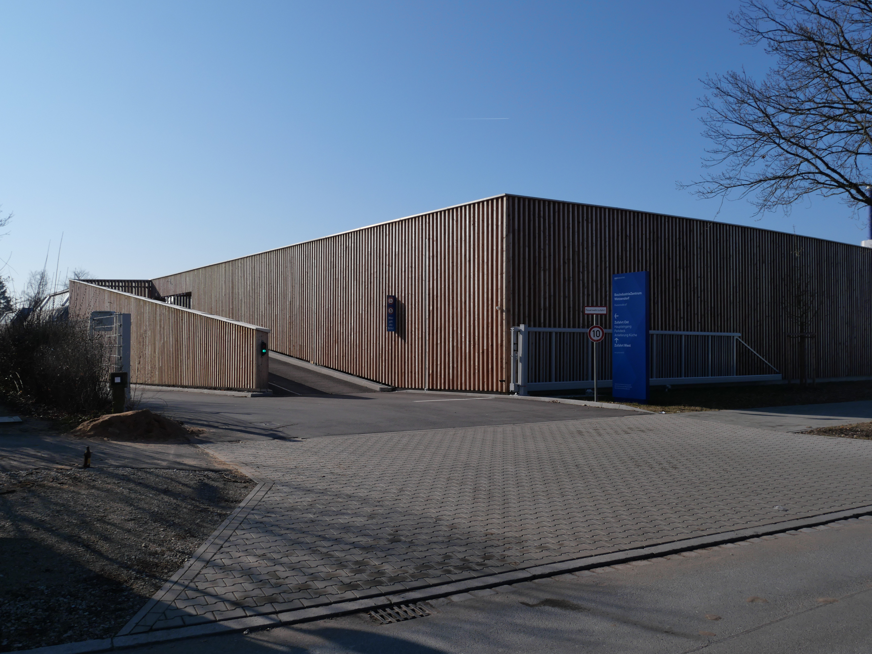 Blick auf die Einfahrt des Holzparkhauses. Aufnahme vom 6. März 2025.