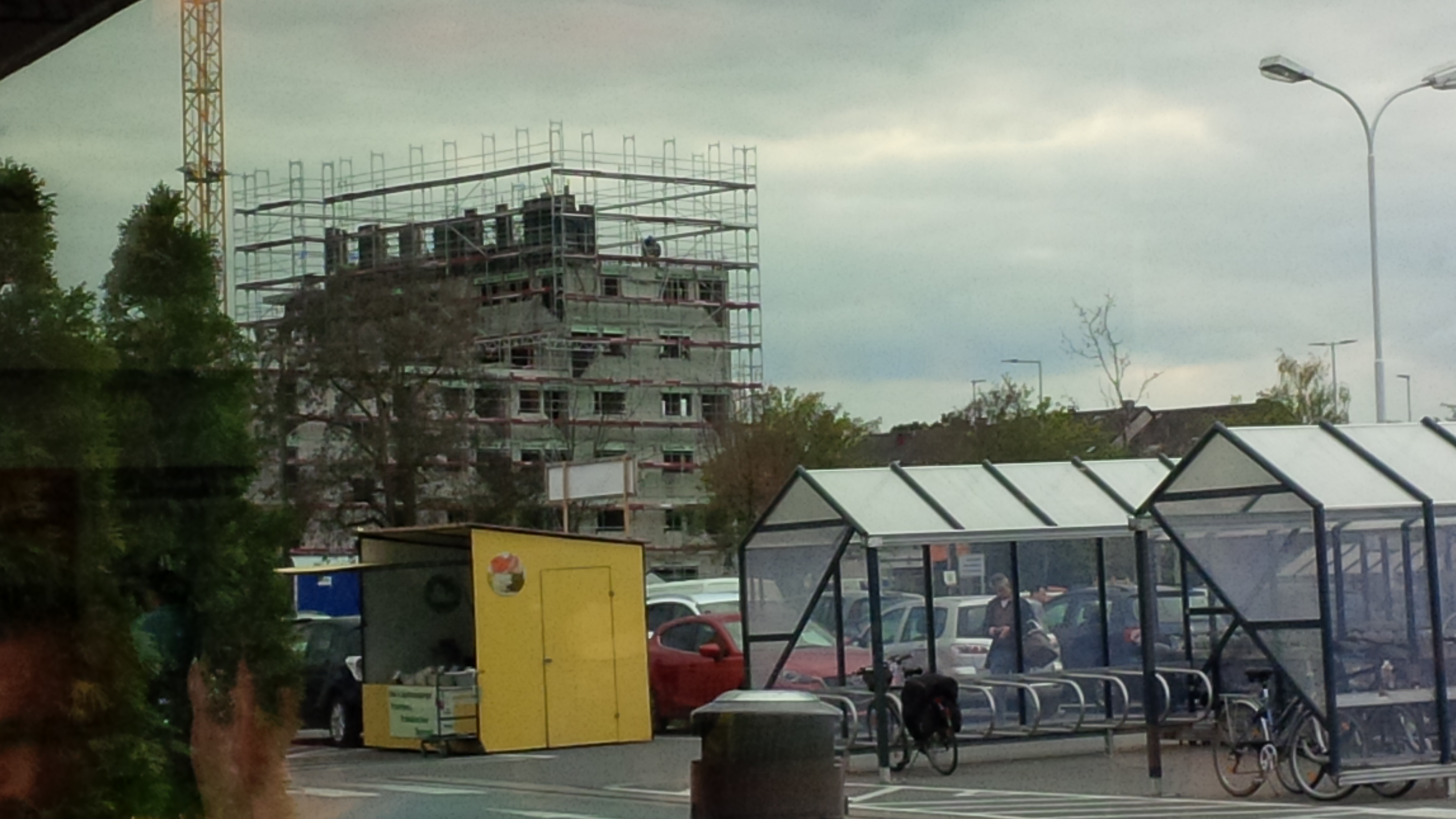 Blick auf die im Bau befindliche Wohnanlage vom Parkplatz des Einkaufszentrums aus. Aufnahme vom 19. April 2016.