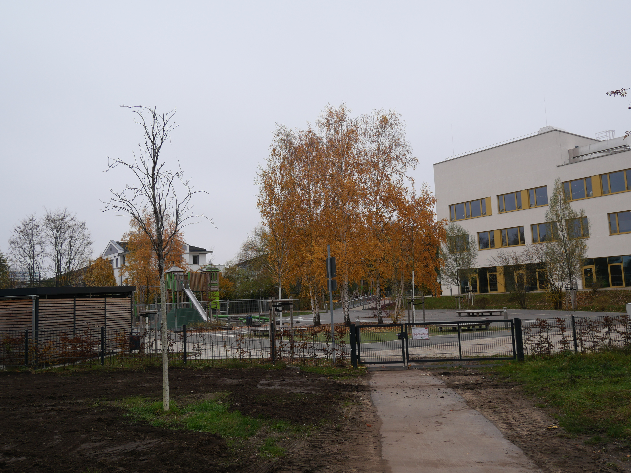 Blick vom Gehweg nördlich der Schule nach Westen. Aufnahme vom 7. November 2025.