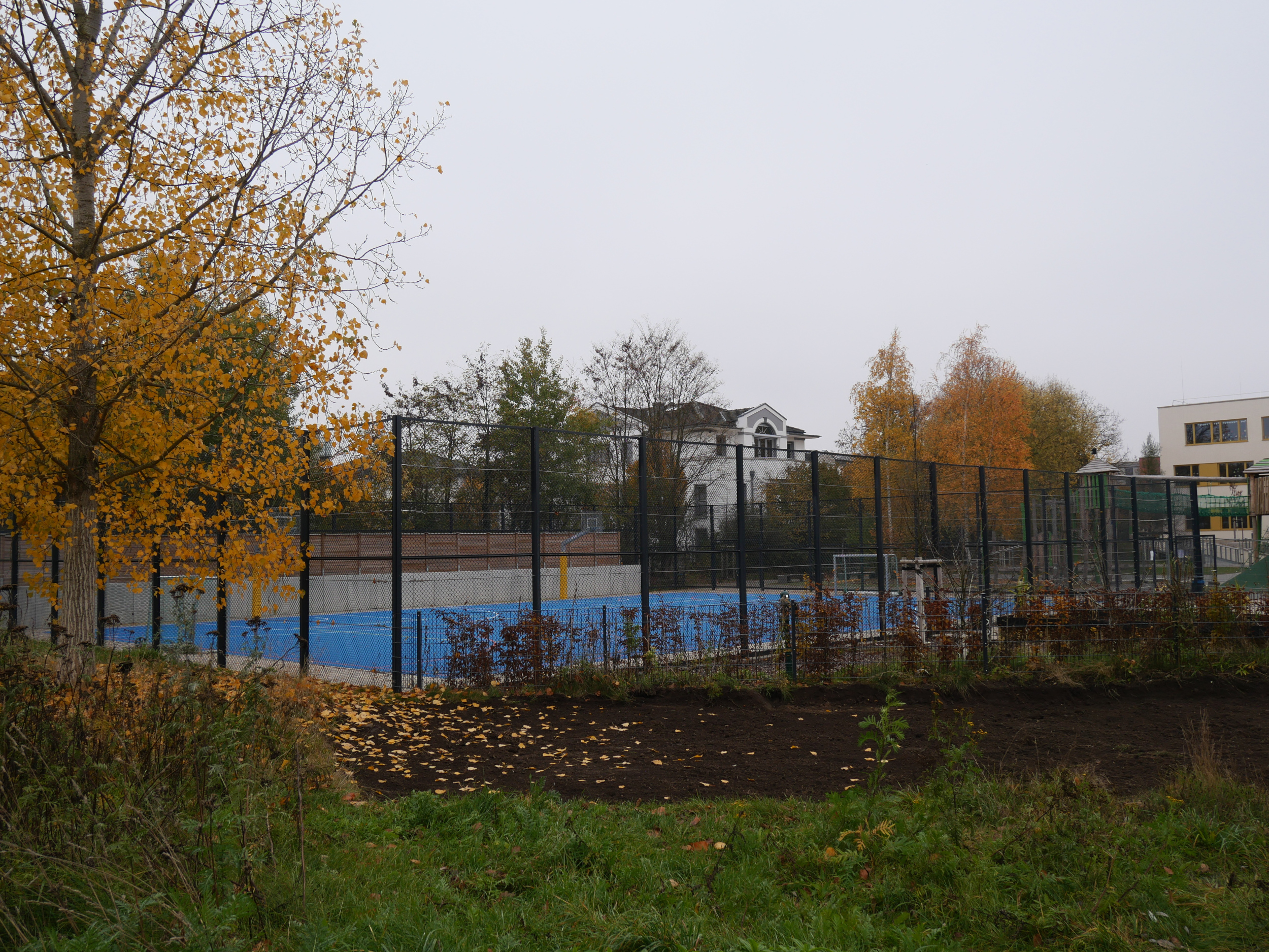 Blick auf den Sportplatz an der Nordseite. Im Hintergrund lugt eines der Geschöpfe des Schultheißviertels hervor. Aufnahme vom 7. November 2025.