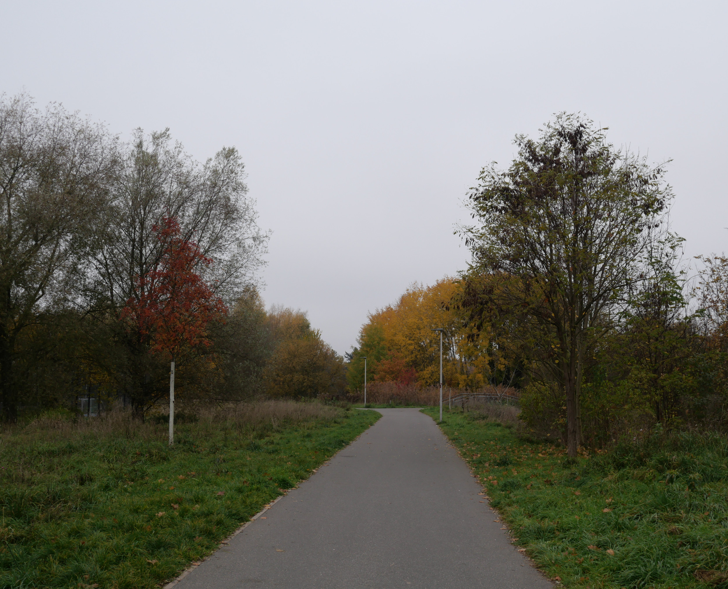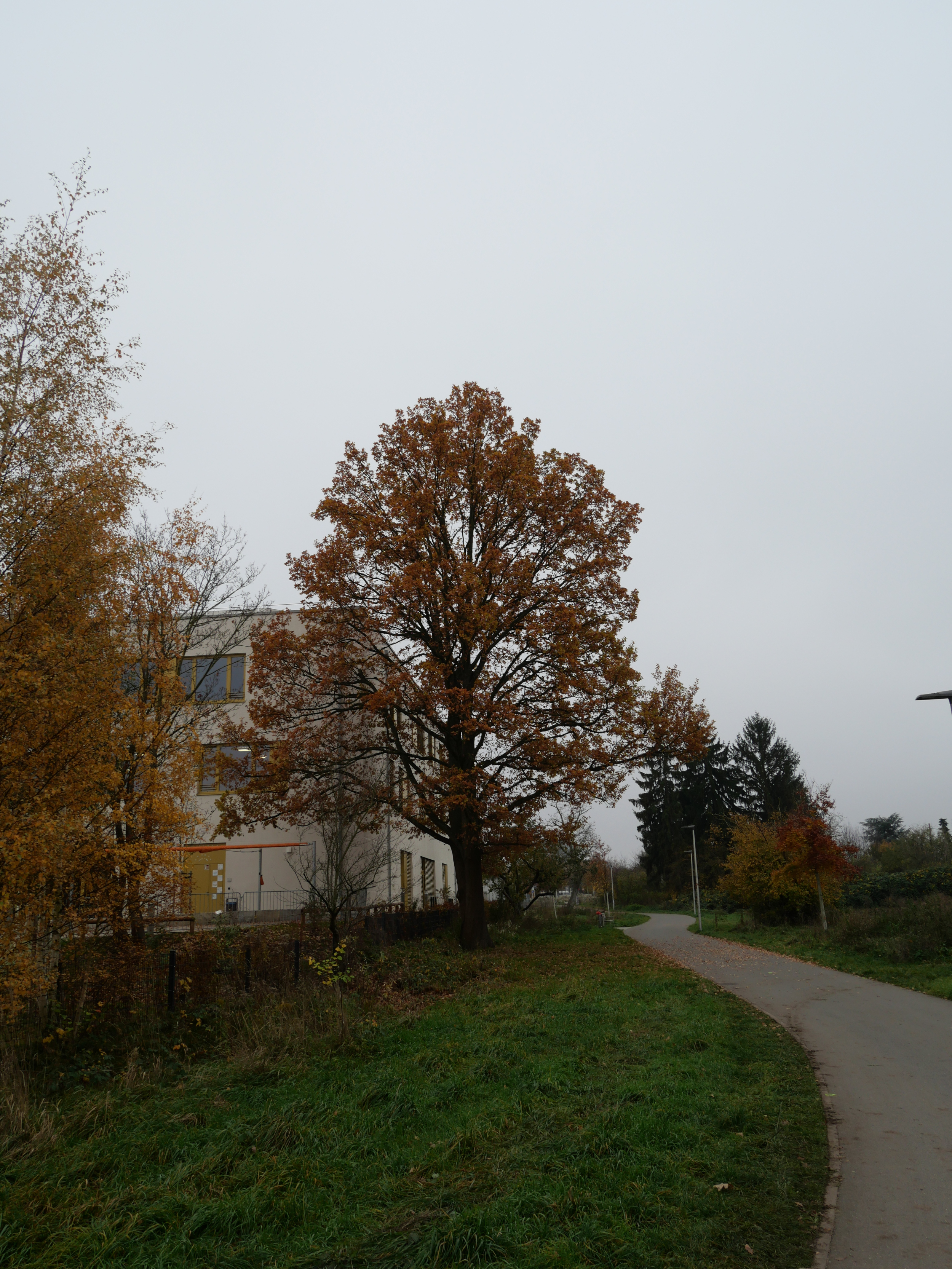 Das unumstritten beste in der Gegend ist für mich jedenfalls die Natur - also genau das, was durch diese Bauprojekte leider fortgesetzt weniger wird. Hier der Blick vom Gehweg nördlich der Schule in Richtung Westen auf einen größeren Baumbestand. Selbst im November noch schön anzusehen.